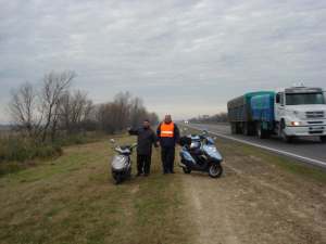Luego de descansar un poco el cuerpo, nos pusimos en marcha nuevamente, y a los pocos metros, el Puesto de Control de Gendarmería. Obviamente, candidatos fijos, ya por el control en si y además por llamar la atención en ruta con 3 scooters.