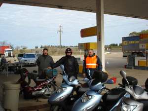 Repusimos combustible y nos encontramos con un viajero que nos llamó muchisimo la atención. Un Pastor misionero que venía viajando en su HONDA WAVE desde la Ciudad de La Plata y se dirigía hacia el Uruguay. Iba completamente cargado, llevando ayuda a un pueblo muy pobre (eso nos manifestó).