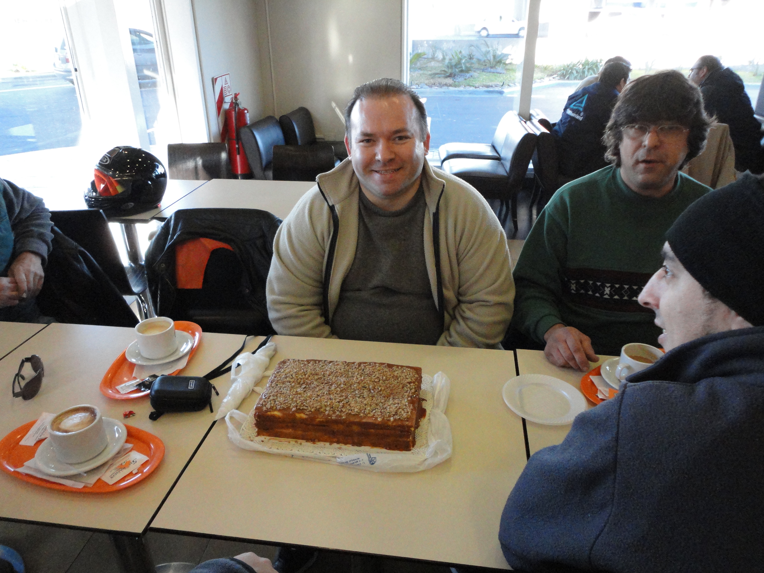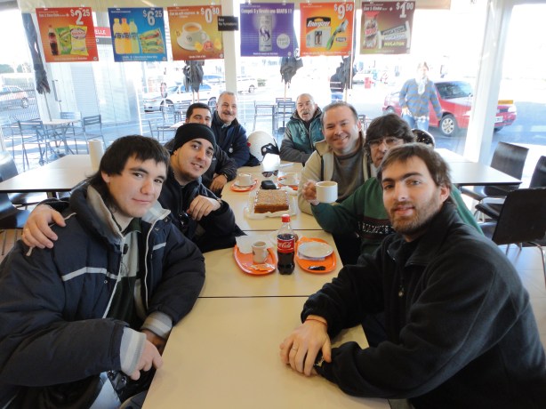 Para nuestra sorpresa, estaban para hacernos el aguante, ya que no fueron parte de los viajeros,  OSCAR y GABRIEL, que cumplió años y que con torta incluida, celebramos su onomástico… Luego de desayunar e intercambiar opiniones sobre el viajes, todas las máquinas se aprestaron a la hora 10:30 a poner proa hacia la meta… Acompañó al Club de Amigos de Honda Elite, el Club de Amigos de Kymco Grand Dink, con dos componentes, que podríamos denominar “únicos” con el Fernet Branca… (En realidad son sólo dos socios… Por eso lo de “únicos”)